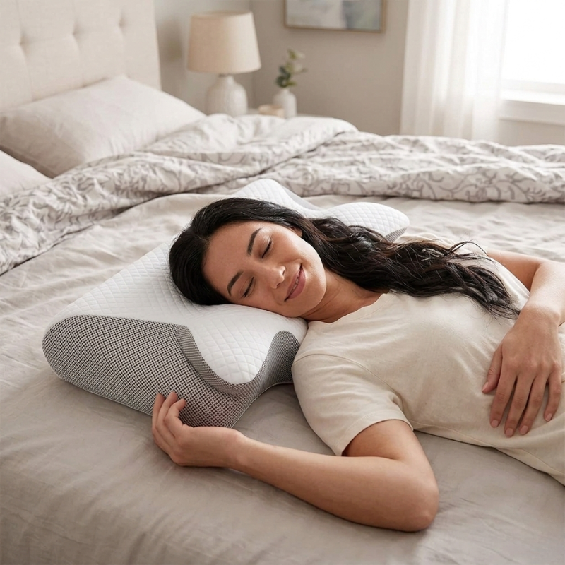 Bæklunarhönnunin samþættir þróaða mótunartækni til að útrýma hálsríg og bæta öndun fyrir dýpri og meira endurnærandi svefn.